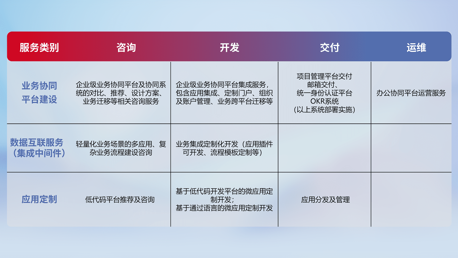 针对钉钉、、、、企微、、、、IDaas等平台级产品提供产品的规划、、方案、、、交付、、、、定制化开发等服务,,,实现如统一协同办公、、、智能客户服务、、、、混合会议管理、、、智能数据查询、、、、等业务场景,,实现数字化转型。。